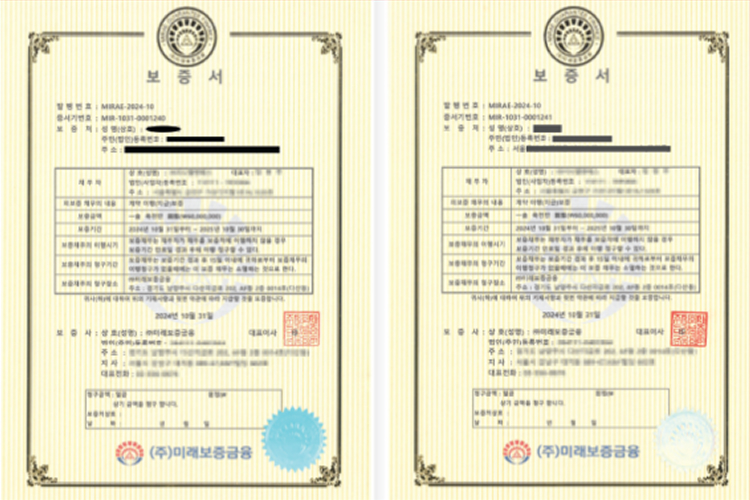 *(주)미래보증금융 100% 보증보험 채권 보증서 발부